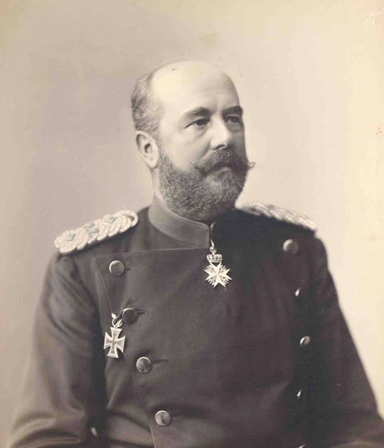 Eduard v. Treskow wuchs auf dem Rittergut Radojewo bei Posen auf und entschied sich früh für die militärische Laufbahn. Mit sieben seiner zwölf Brüder nahm er an den Kriegen von 1864 teil 1866 teil, mit acht Brüdern zog er in den Deutsch-Französischen Krieg von 1870/71. Am Tag des Kriegsbeginns, dem 19. Juli 1870, heiratete er in Kassel Klara Hausmann, die Tochter des 1871 nobilitierten Artillerie-Generals Karl v. Hausmann (1816-1879), mit dem er am 6. August 1870 die Schlacht bei Wörth im Elsass durchlebte. Eduard v. Treskow war nach dem Krieg Hauptmann und Major im Hessischen Infanterie-Regiment Nr. 83 unter Befehl des Fürsten Georg Franz zu Waldeck und Pyrmont, im Jahre 1880 wurde er Kommandeur des Hessischen Leibgarde-Regiments Nr. 115 unter Großherzog Ludwig IV. von Hessen in Darmstadt. In den Jahren 1888-1891 war er Kommandeur des 3. Infanterie-Regiments „Alt-Württemberg“ in Ludwigsburg bei Stuttgart. Hier wurde er 1891 als Generalmajor verabschiedet. Eduards Schwager Konrad von Hausmann (1853-1923) wurde ebenfalls preußischer General in Metz und Karlsruhe, er war seit 1882 mit einer Tochter des Industriellen und BASF-Gründers Friedrich Engelhorn aus Mannheim verheiratet. Das neu erworbene Hausmannsche Schloss Sinnershausen in Thüringen, 1859-1861 für Erbprinz Georg von Sachsen-Meiningen im "Schweizerhausstil" umgebaut, war Mittelpunkt der unsteten Familie. Nach seinem Abschied zog Eduard v. Treskow mit Frau und Tochter nach Bad Doberan und erwarb am dortigen Alexandrinenplatz ein klassizistisches Stadthaus, das sich 1823/24 der Architekt Carl Theodor Severin erbaut hatte - von Severin stammen das Theater in Bad Doberan (1805/06) und das berühmte Kurhaus im Seebad Heiligendamm (1814/16). In dem neuen Haus am Alexandrinenplatz 5 lebte die Witwe Klara v. Treskow bis zu ihrem Tod 1927 und die Tochter Elisabeth bis 1957. |