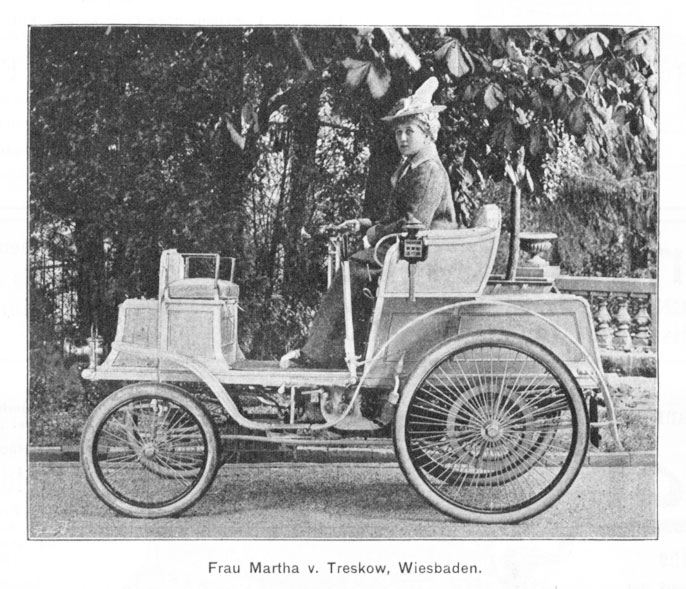 Martha von Treskow gehörte zu den ersten Frauen in Deutschland, die sich an das Steuer eines Automobils setzten - und auch zu den ersten, die dafür eine Anzeige kassierten: in ihrem Fall war das bereits 1906. Als erste Frau mit Führerschein in Deutschland gilt dennoch Amalie Hoeppner aus Leipzig, die 1909 ihre Prüfung ablegte – allerdings wurde der deutschlandweite Führerschein erst in diesem Jahr eingeführt. Schon in den zehn Jahren davor fuhren Frauen ungeniert und ungeprüft mit dem Auto – auch wenn die „Allgemeine Automobil-Zeitung“ dies 1902 mit zunehmender Sorge sah: „Man darf wohl, ohne ungalant zu werden, die Behauptung wagen, dass sich bei den wenigsten Vertreterinnen des zarten Geschlechts jene Eigenschaften finden, die eine gute Automobilistin unbedingt haben muss: Kaltblütigkeit, rasches Auffassen der Situation, blitzartiges Entschließen, Vorsicht, Niederzwingen des in jedem Automobilisten schlummernden Schnelligkeitswahnsinns.“ Schon 1907 war es nach Beobachtung der „Allgemeine Automobil-Zeitung“ ein um sich greifendes Phänomen, „dass sich jetzt vielfach alleinstehende vornehme Damen größere Luxusautomobile anschaffen“ – so auch Martha v. Treskow in Wiesbaden. Treuer Gefährte auf ihren abenteuerlichen Reisen war seit 1902 der schneeweisse Benz Patent-Motorwagen Ideal (4,5 PS, 35 km/h); 1906 wurde er durch ein Adler Phaeton Cabriolet ersetzt, das es mit 12 PS immerhin auf 50 Stundenkilometer brachte.