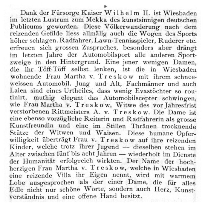 Voraussetzung für das Leben hinter dem Steuer war allerdings die materielle und familiäre Unabhängigkeit: ursprünglich war Martha 1883 als Zwanzigjährige aus Königsberg nach Posen gekommen, um den beiden Kindern des Gutsherrn Albrecht v. Treskow in seinem neuerbauten Schloss Biedrusko eine strenge Gouvernante zu sein. Sie kam, sah sich um und heiratete geistesgegenwärtig den Hausherrn, dem sie in rascher Folge fünf weitere Kinder schenkte. Schon 1901 fand sie sich als reiche Witwe in Wiesbaden wieder: der Ehemann war verstorben, die Posener Güter verkauft. Das neue Leben in der Wiesbadener „Villa Treskow“, nur einen Steinwurf vom Spielcasino und einem sorgenfreien Leben entfernt, bot ihr vor allem eines: Freiheit. Und ein eigenes Automobil.